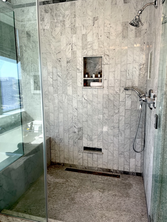 The shower is perfect. Lovely products, excellent hardware, beautiful marble mosaic floor. And note the city-view window!
