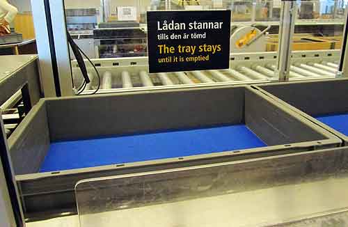 We could easily have walked away from it. I wonder how many people do? This security check point is at Stockholm’s Arlanda Airport. London Heathrow has the same setup. I’ve seen it in other airports, too, but I can’t remember where. Copenhagen? Munich?
